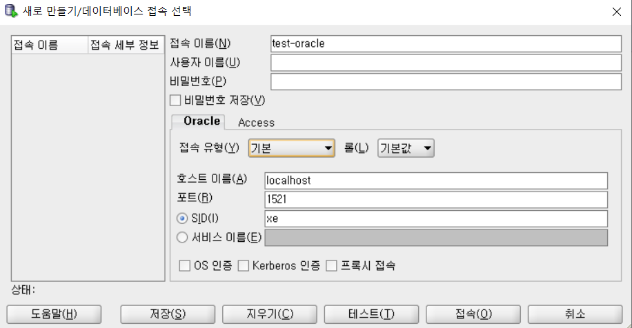 다음 테스트를 누르고 상태가 성공이면 접속을 눌러서 연결한다.