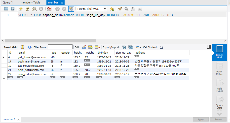 SELECT * FROM copang_main.member WHERE sign_up_day BETWEEN '2018-01-01' AND '2018-12-31';
