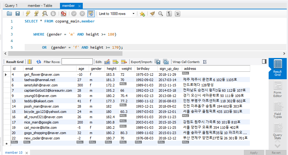 -> 남자중에서 키가 180이상이고 혹은 여자중에서 키가 170이상인 사람