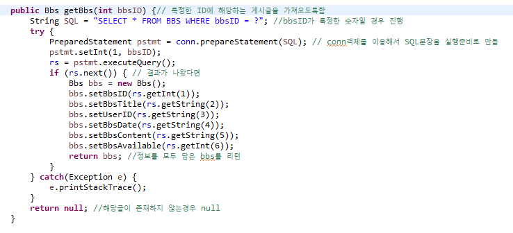 console에 이런게 찍혀서 블로그를 찾아보니 쿼리가 잘못되었을때 나오는 오류라고 하여 아무리 봐도 문제가 없는듯하였는데 쿼리 문제가 맞았다. 하도 안되서 다시 싹 지우고 하니까 된다. DAO에서 게시물 목록을 조회, 안에 게시물 조회를 위한 쿼리가 있음 // 검색 조건에 맞는 게시물 목록을 반환합니다. public List selectList(Map map) { List bbs = new Vector(); // 게시물 목록 조회 결과를 담을 변수 // Vector - ArrayList와 비슷함 스레드 환경에서의 안정성은 높지만 ArrayList와 비교하여 추가, 검색, 삭제 성능 떨어짐 String query = "SELECT * FROM board "; if (map.get("searchWord")..