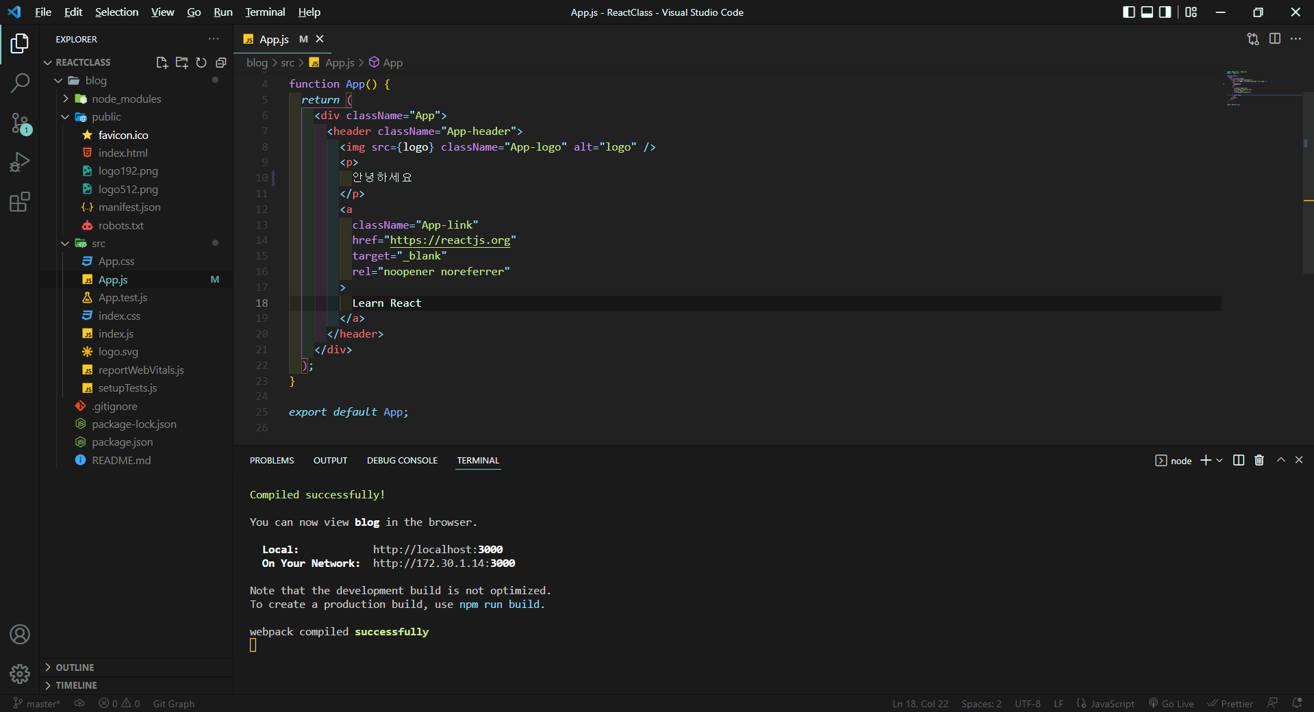 리액트 설치 node.js 설치 node.js => 브라우저에서만 사용할 수 있는 자바스크립트를 브라우저 밖에서도 사용할 수 있게함 vscode 설치 커맨드 create-react-app으로 리액트 프로젝트 생성 npm init react-app vscode, 터미널에서 npm init react-app . 개발 모드 실행 npm run start 개발 모드 종료 ctrl + C 리액트 개발자도구 (리액트구조를 살펴볼 수 있는 도구) React Developer Tools 검색후 설치 F12 누른후 확인 components - 리액트 개발의 기본적인 단위 페이스북, 인스타그램, 넷플릭스 모두 리액트로 만들어져 있다. 접속후 리액트 개발자도구로 확인해봐도 좋다.