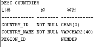 컬럼의 순서를 알고있다면 아래와 같이 입력하여 INSERT가 가능하다. INSERT INTO COUNTRIES VALUES('UI', 'Ukraine', 4); 다음과 같은 방식으로 컬럼의 내용을 확인한다. -- 해당 테이블안의 컬럼 내용을 확인하여 복사하고 아래 SELECT문에 복사한다. -- 일일히 컬럼을 적을 필요 없이 바로 삽입가능 하다. DESC COUNTRIES; 위에서 순서를 확인하고 넣고싶은 값이 있는곳은 값을 넣고 넣고 싶은 값이 없는곳은 그대로 컬럼이름을 써준다. -- 순서에 맞춰서 넣고 싶은 값을 넣는다. INSERT INTO COUNTRIES SELECT 'BS' ,'Belarus' ,4 FROM COUNTRIES WHERE COUNTRY_ID = 'UI' ; * WHERE절이 필요..