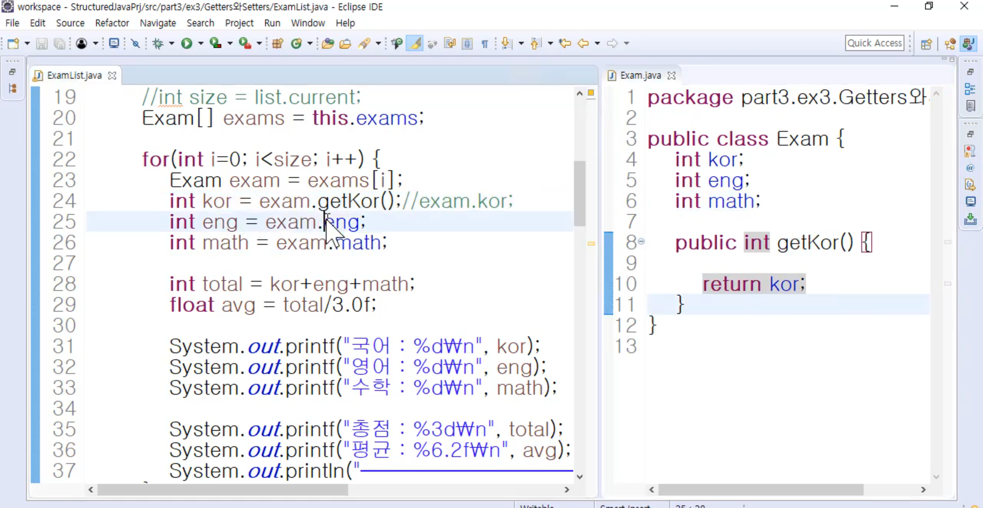 get 함수와 set 함수를 만들어 이용하여 캡슐을 깨트리지 않고 간접적으로 데이터를 가져옴 같은 클래스가 아닌 다른 클래스에서 많은 데이터를 가져다가 썼다가 다른 클래스에서 수정이 일어날 경우 코드양이 많은 경우 수정하기 복잡할 수 있음 package Exam_1.getter_setter; public class Exam { int kor; int eng; int math; public int getKor() { return kor; } public int getEng() { return eng; } public int getMath() { return math; } public void setKor(int kor) { this.kor = kor; } public void setEng(int eng) ..